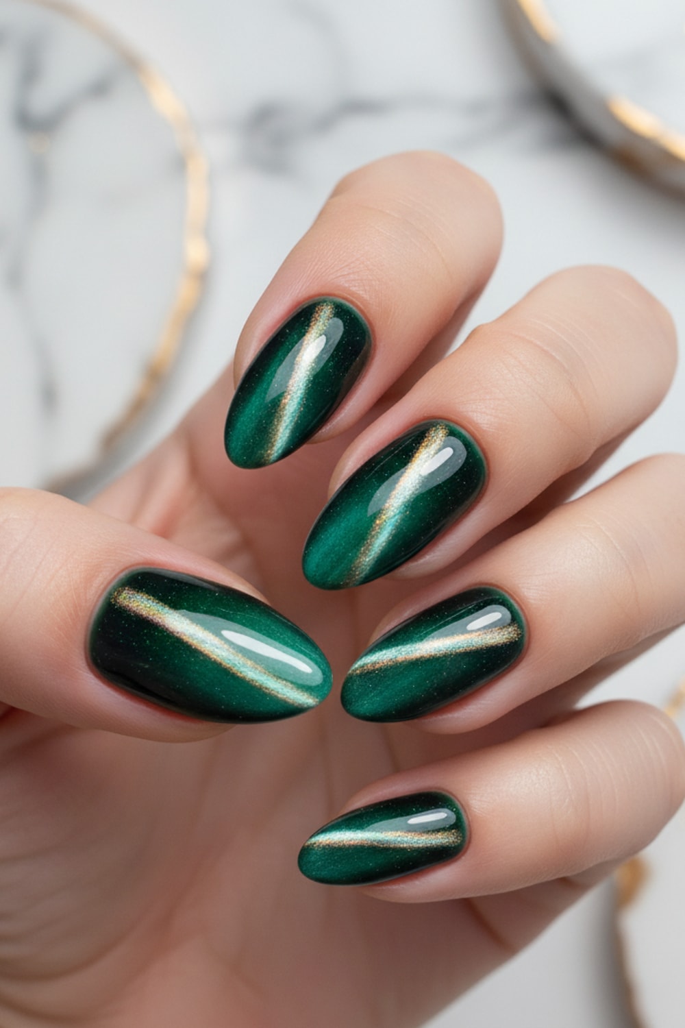 It's achieved through precise application of specialized magnetic gel polish and strategic use of a strong magnet to manipulate the metallic particles, creating deep, shifting lines of light that mimic natural depth.
