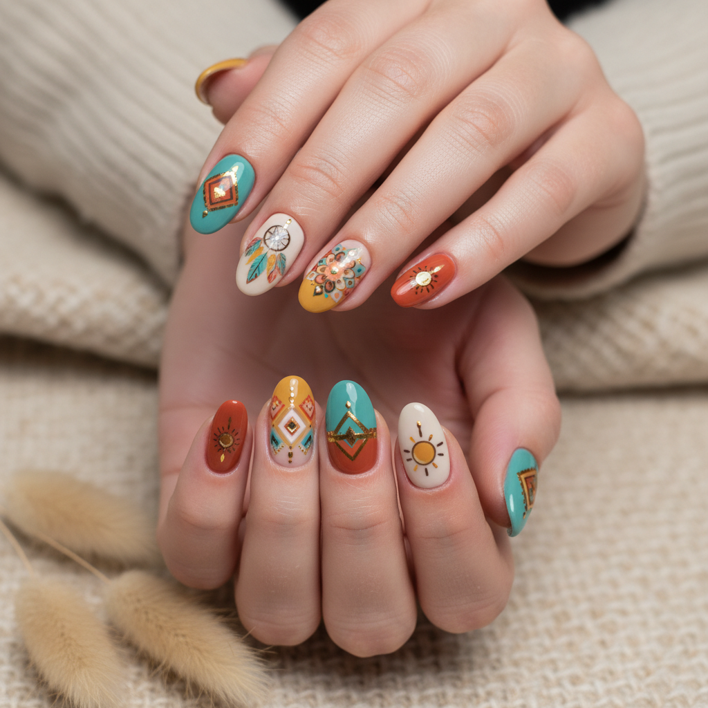 - Use a fine-tipped brush or stamping plate to create intricate Boho patterns with terracotta, burnt sienna, and gold polishes.