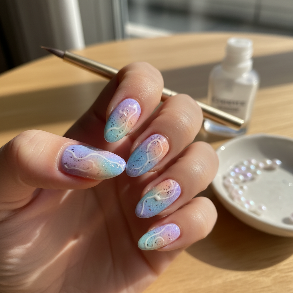 Inspired by professional salon techniques that achieve airbrushed nail looks, this design aims to simplify the process for at-home application.