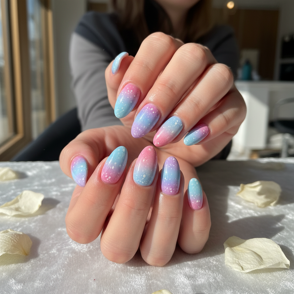 Achieve a flawless, salon-quality gradient with this sponged ombre nail design. This technique creates a seamless blend of colors for a sophisticated and eye-catching look.