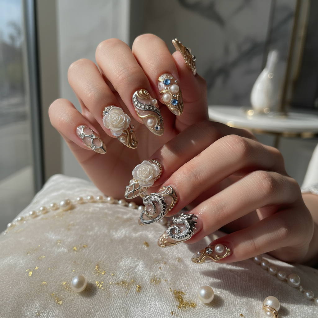 Inspired by the delicate intricacies of botanical illustrations, high-fashion runway floral accents, and the timeless elegance of fine porcelain artistry, this design elevates nail art to a sophisticated, wearable sculpture.
