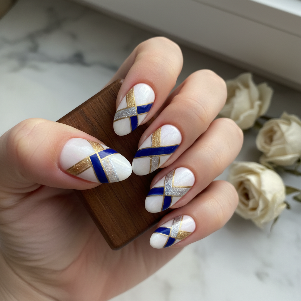 - →**Matte & Gloss Contrast:** Use a matte top coat for the main chevron and a high-gloss top coat for the metallic accent lines.