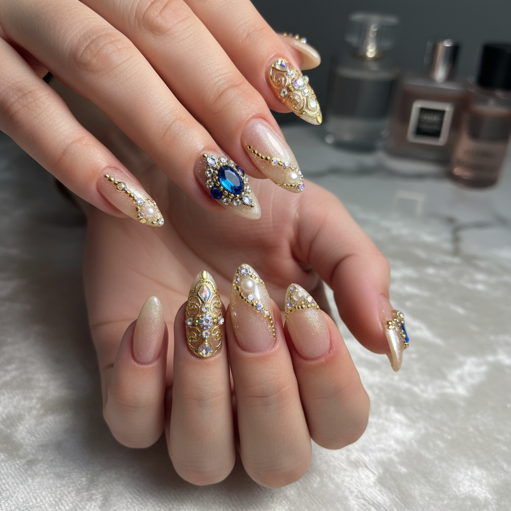 - Optionally, apply a few tiny gold micro-crystals with gem glue for added subtle sparkle, if part of your custom design. Cure if using gel glue.