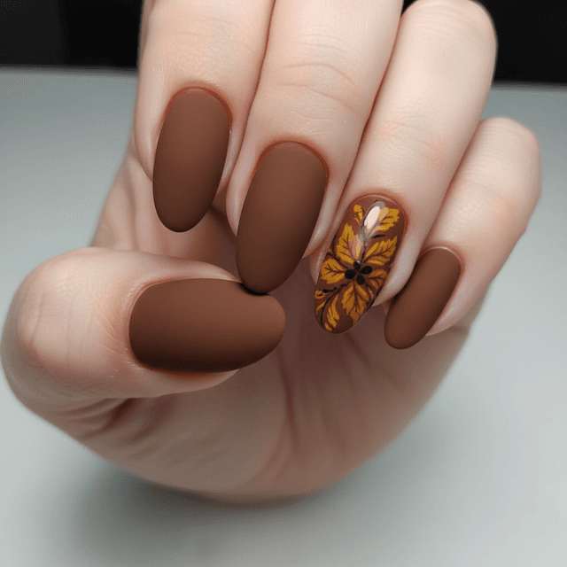 Fall nail art with brown base, orange pumpkins, and gold autumn leaves