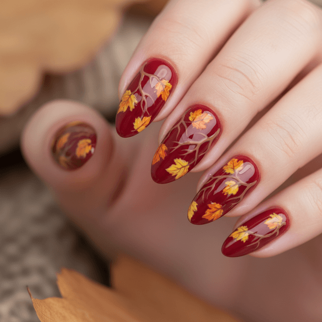 Fall nail design with deep red base, yellow leaves, and brown tree branch patterns