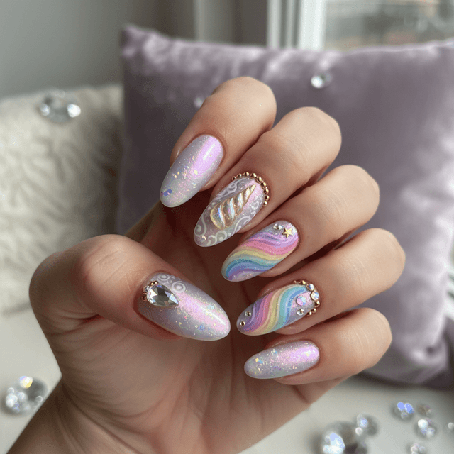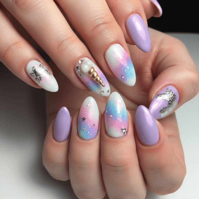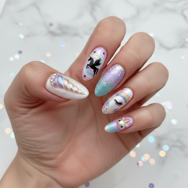 Unicorn inspired nail art with elegant, photo-real finish and professional salon quality