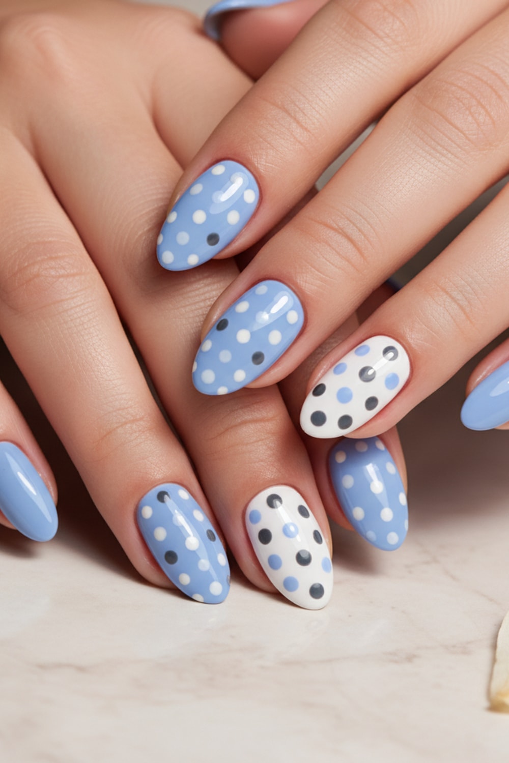 Polka Dots inspired nail art with elegant, photo-real finish and professional salon quality