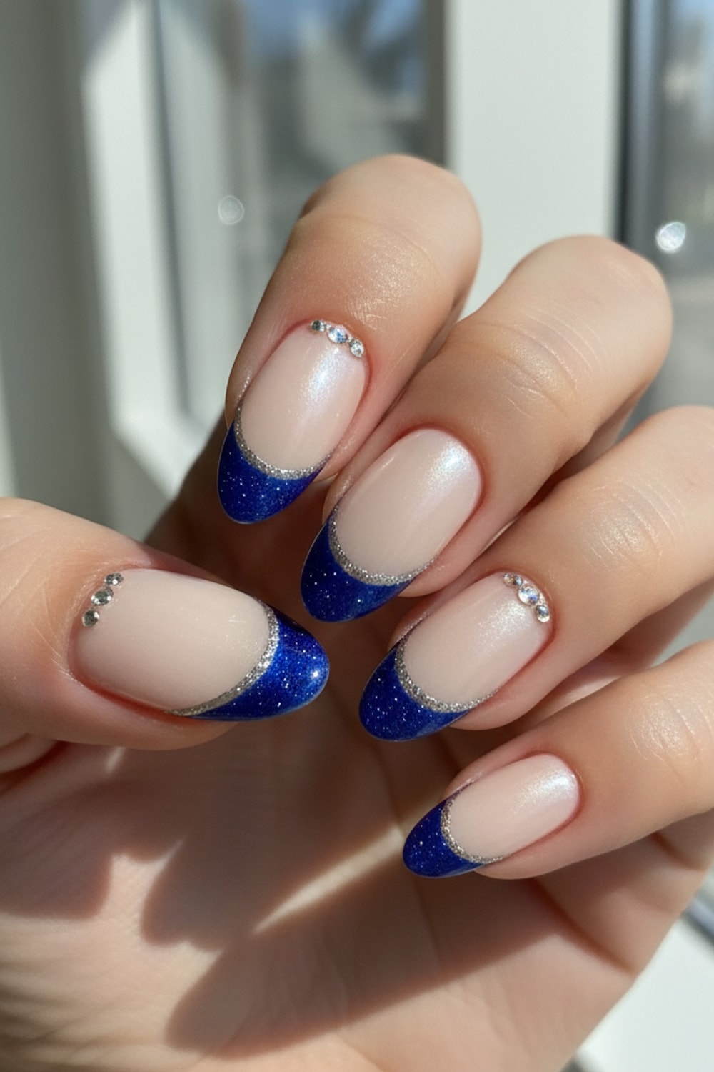 Oval, almond, and squoval shapes beautifully complement the natural curve of the Reverse French design, enhancing its elegant and sophisticated appeal.