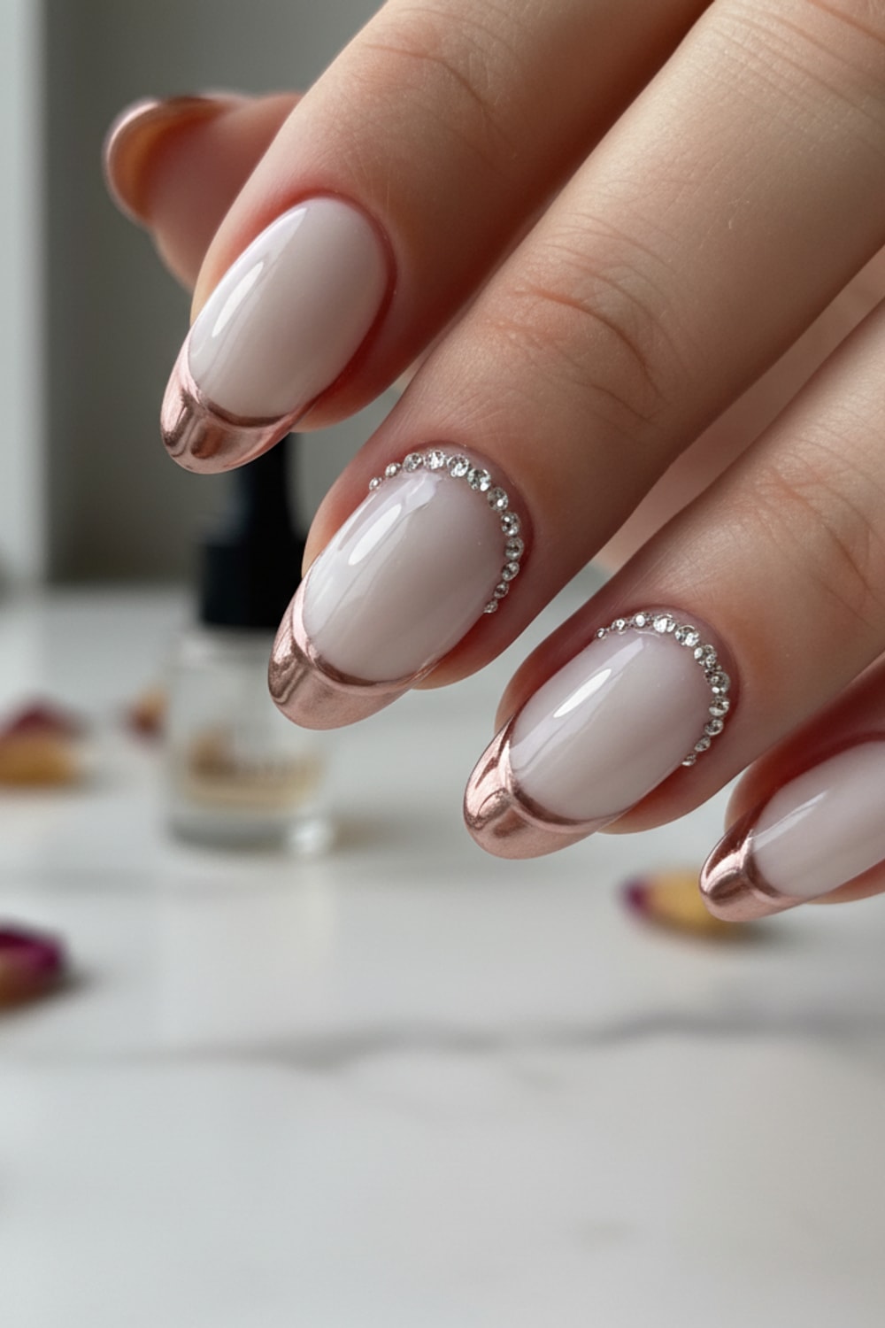 - Apply another thin layer of the nude/pink gel polish over the entire nail, blending the white line softly for a seamless, photo-real effect.